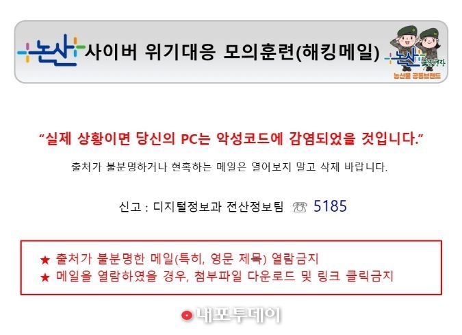 논산시는 5일과 6일 이틀간 전 직원을 대상으로 ‘해킹메일 모의훈련’을 진행했다.