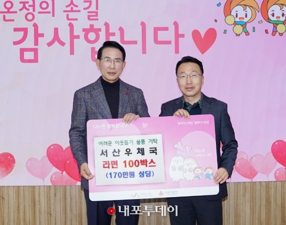 (내포투데이) 충남 서산시는 5일 서산우체국에서 어려운 이웃을 돕기 위해, 170만 원 상당의 라면 100박스를 기탁했다고 밝혔다.