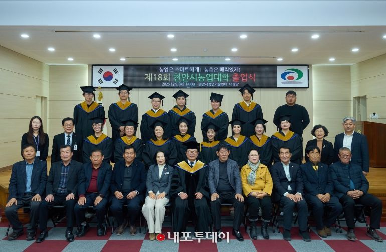 (내포투데이) 천안시농업기술센터가 9일 ‘제18회 천안시농업대학 졸업식’을 열고 46명의 졸업생을 배출했다.
