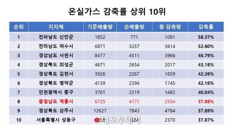 (내포투데이) 계룡시는 공공부문 온실가스 감축률 평가에서 전국 243개 지방자치단체 중 8위를 기록해 충청남도 내 유일하게 ‘상위 10개 기관’에 선정됐다고 11일 밝혔다.