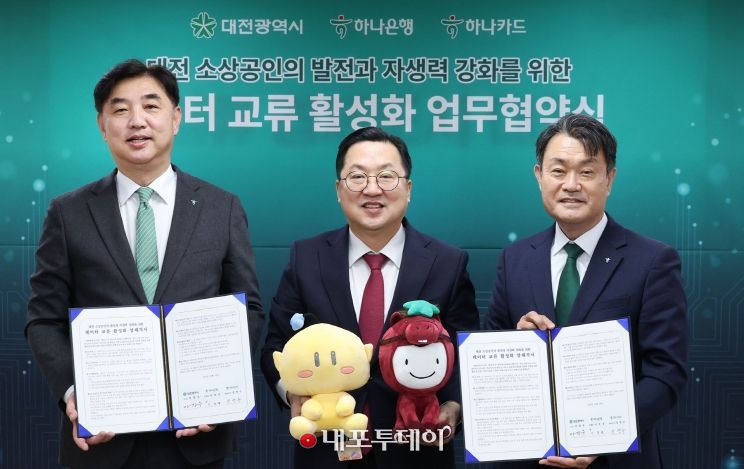 (내포투데이) 대전시는 16일 하나은행과 하나카드와 함께 지역 소상공인의 지속 가능한 성장 기반을 마련하기 위한 ‘데이터 교류 활성화 업무협약’을 체결했다.