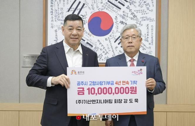 (내포투데이) 공주시는 지난 9일 ㈜기산엔지니어링 강도묵 회장이 4년 연속 고향사랑기부제 고액 기부를 이어가며 남다른 고향사랑의 마음을 전하고 있다고 밝혔다.