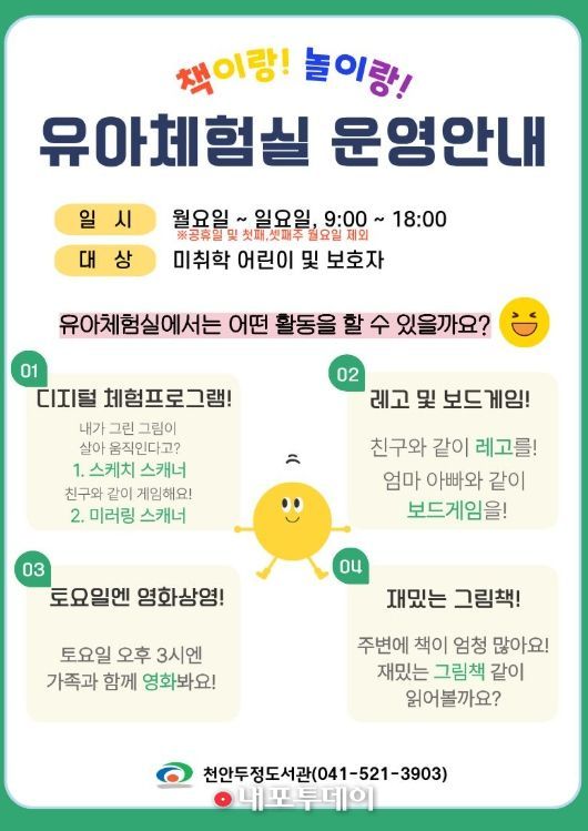 (내포투데이) 천안시 두정도서관은 미취학 아동을 위한 ‘놀이 기반 독서 환경’인 유아체험실을 운영해 주민들로부터 호응을 얻고 있다고 12일 밝혔다.
