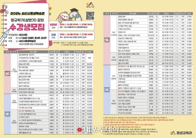 서산시민대학 상반기 정규학기는 서산시민이라면 누구나 참여할 수 있으며, 온라인과 전화로 신청할 수 있다.