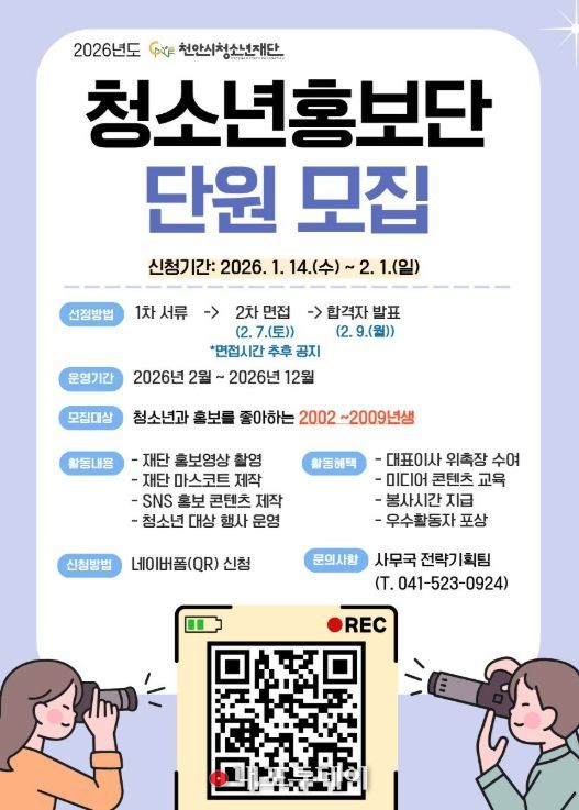 (내포투데이) (재)천안시청소년재단은 청소년 주도의 소통 강화를 위해 ‘2026 청소년홍보단-청마루’ 단원을 모집한다고 16일 밝혔다.
