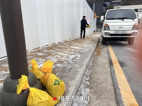 읍 직원들은 현장에서 직접 모래주머니와 염화칼슘을 운반해 꽁꽁 얼어붙은 노면에 살포하며 미끄럼 위험을 완화했다.