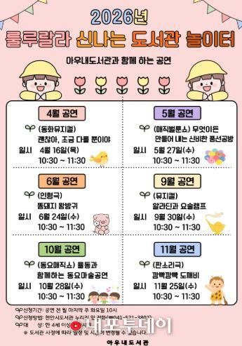 참여 신청은 공연 전월 마지막주 화요일 오전 10시부터 전화 등으로 가능하며, 자세한 사항은 천안시도서관 누리집에서 확인할 수 있다.