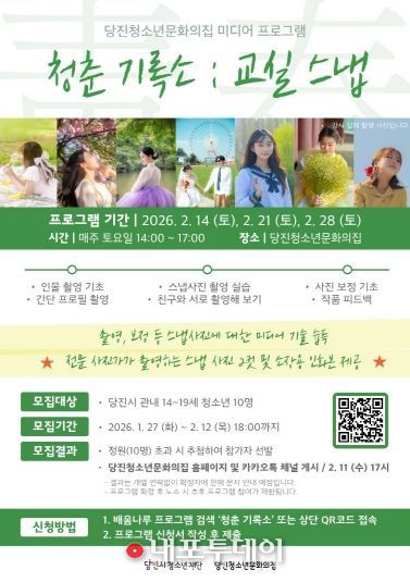 (내포투데이) (재)당진시청소년재단 당진청소년문화의집(관장 유수민)은 오는 2월 14일부터 28일까지 매주 토요일, 14시부터 17시까지 관내 14~19세 청소년을 대상으로 미디어 프로그램 [청춘 기록소 : 교실 스냅]을 운영할 예정이다.
