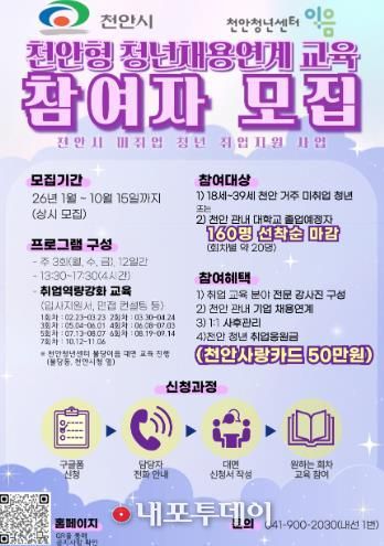 (내포투데이) 천안시는 ‘2026년 천안형 청년 채용연계 프로그램’ 참여자 160명을 선착순 모집한다고 27일 밝혔다.