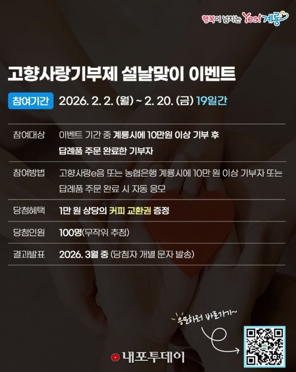 시 관계자는 “설 명절을 맞아 고향을 응원하는 마음을 기부로 표현할 수 있도록 이번 이벤트를 마련했다”며 “더 많은 분들이 고향사랑기부제에 참여해 계룡시 발전에 힘을 보태주길 기대한다”고 말했다.