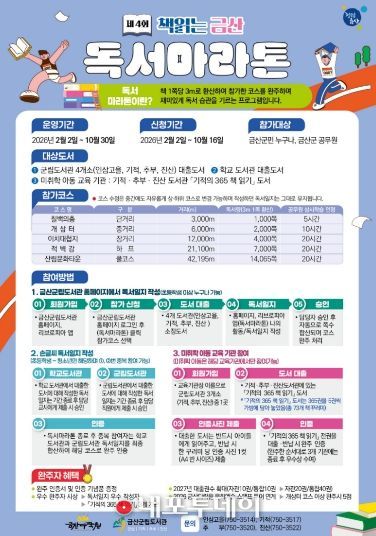 (내포투데이) 금산군은 일상 속 군민들의 독서 습관 형성을 돕고 책 읽는 공동체 문화를 확산하기 위해 2월 2일부터 10월 30일까지 제4회 독서마라톤을 개최한다.