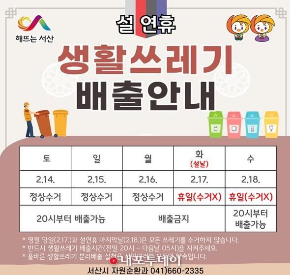 시는 설연휴 생활 쓰레기 수거 일정을 2월 13일까지 서산시 누리집, 중앙호수공원 전광판, 서산시 사회관계망서비스 등을 통해 시민에게 홍보할 계획이다.