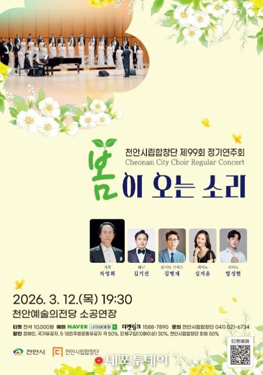(내포투데이) 천안시립합창단이 오는 3월 12일 천안예술의전당 소공연장에서 제99회 정기연주회 ‘봄이 오는 소리’를 개최한다.