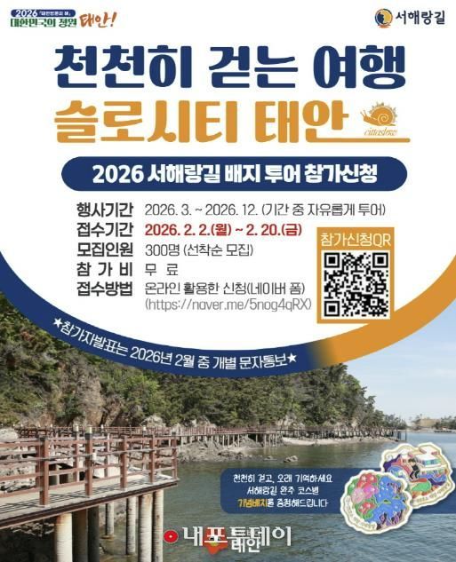 참가는 무료이며 2월 2일부터 20일까지 온라인(네이버 폼)을 통해 선착순 300명을 모집한다. 이번 프로그램은 슬로시티 태안의 이미지를 널리 알리고 걷기 여행을 통해 지역 경제에 활력을 불어넣고자 기획됐다.