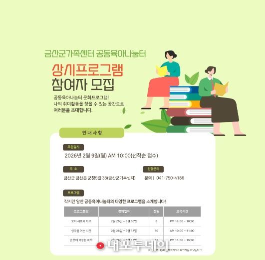 (내포투데이) 금산군가족센터는 영유아 및 초등 자녀를 둔 가정은 물론 지역 내 성인을 대상으로 2026년 상반기 공동육아나눔터 상시프로그램 참여자를 2월 9일 오전 10시부터 선착순 모집한다.
