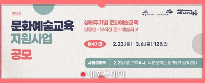 (내포투데이) 세종시문화관광재단은 일상 속 시민 문화예술교육 활성화를 위한 2026년 생애주기별 문화예술교육 지원사업 공모를 진행한다.