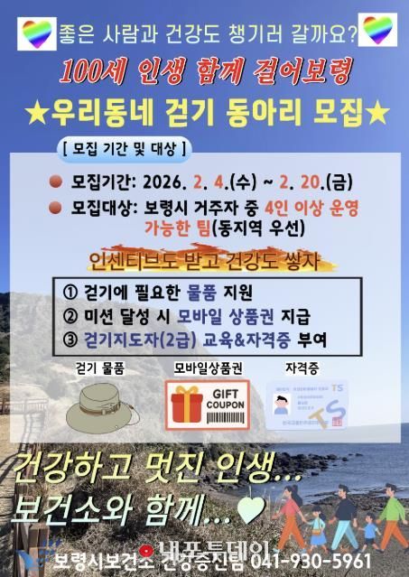 (내포투데이) 보령시는 주민의 신체활동 증진과 건강한 생활습관 형성을 위해 ‘우리동네 걷기동아리’ 참여 팀을 오는 20일까지 모집한다.