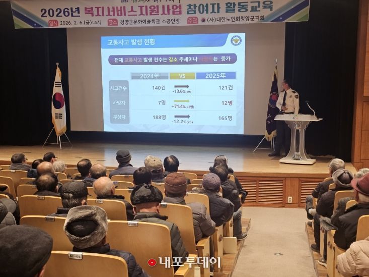 (내포투데이) (사)대한노인회 청양군지회(지회장 전석호)는 지난 6일, 복지서비스 지원사업 참여자 150명을 대상으로 청양경찰서와 연계한 ‘2026년 노인 일자리 참여자 교통안전교육’을 실시했다.