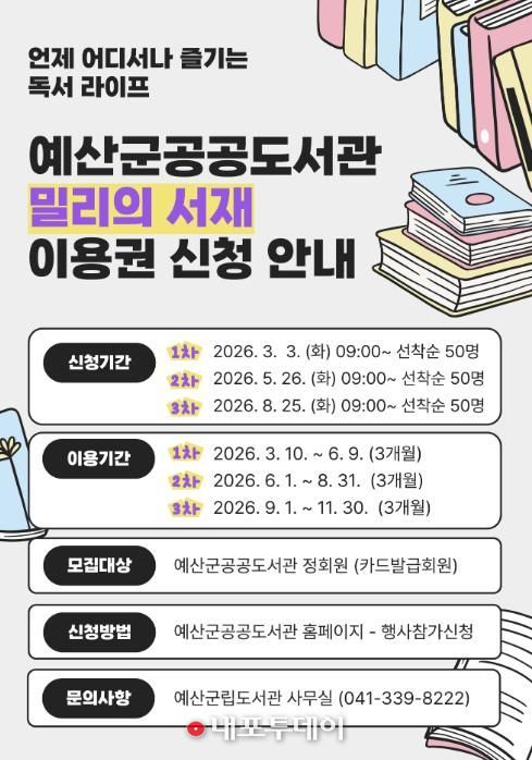 (내포투데이) 예산군 공공도서관은 지역주민의 디지털 독서 접근성을 높이고 생활 속 독서문화 확산을 위해 ‘구독형 전자책 지원 사업’을 운영한다.