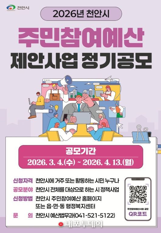 (내포투데이) 천안시가 시민이 직접 예산 편성 과정에 참여하는 ‘2026년 주민참여예산 제안사업 정기공모’를 실시한다.