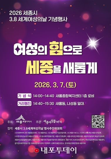 (내포투데이) 세종시사회서비스원이 운영하는 세종여성플라자는 오는 7일 세계 여성의 날을 맞아 새롬종합복지센터에서 ‘여성의 힘으로 세종을 새롭게’를 주제로 기념행사를 개최한다.