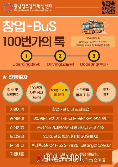 (내포투데이) (재)충남창조경제혁신센터가 지역 내 유망 스타트업의 신속한 발굴과 실질적인 투자 유치를 지원하기 위해 2026 창업-BuS ‘100번가의 톡’ 프로그램에 참여할 기업을 상시 모집한다고 밝혔다.