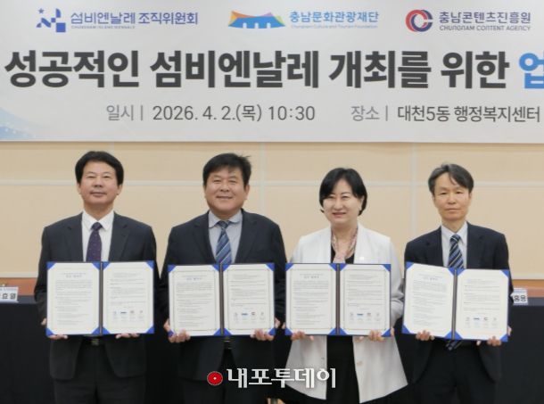 (내포투데이) (재)섬비엔날레조직위원회(사무총장 고효열)는 ‘제1회 섬비엔날레’의 성공적인 개최를 위해 2일 대천5동 회의실에서 충남문화관광재단(대표이사 이기진), 충남콘텐츠진흥원(원장 김곡미), 한국관광공사 대전충남지사(지사장 심홍용)와 4자 업무협약(MOU)을 체결했다고 밝혔다.
