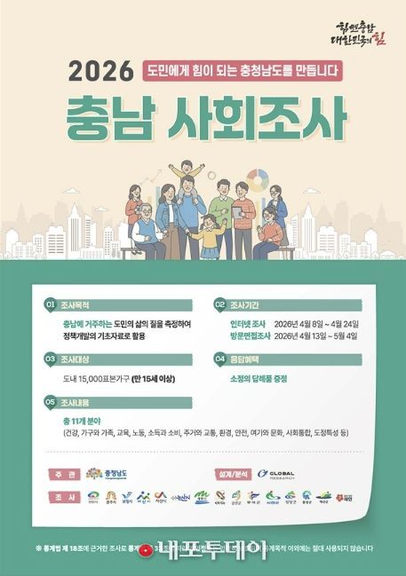 (내포투데이) 충남 서산시는 4월 8일부터 5월 4일까지 ‘2026년 충남 사회조사’를 진행한다고 밝혔다.