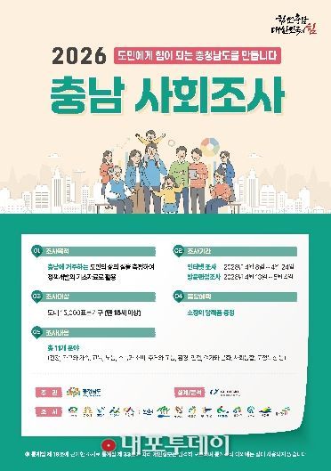 (내포투데이) 천안시는 충청남도와 함께 내달 4일까지 시민의 사회적 상태를 측정해 정책 방향을 제시하는 ‘2026 충남 사회조사’를 실시한다고 8일 밝혔다.