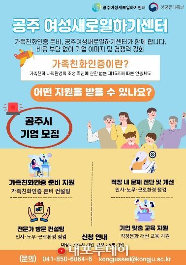 (내포투데이) 공주여성새로일하기센터는 지역 내 기업의 가족친화인증 준비와 직장문화 개선을 지원하기 위해 2026년 경력단절예방지원사업의 하나로 ‘가족친화인증 기업 컨설팅’ 참여기업을 모집한다고 밝혔다.