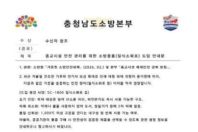 (내포투데이) 최근 세종소방본부를 사칭해 소방용품 구매를 강요하는 사기 시도가 잇따르고 있어 시민들의 각별한 주의가 요구된다. 세종소방본부에 따르면 지난 4일 소방기관 담당자를 사칭한 공문이 전의면 소재 숙박업소 2곳에 전화 또는 문자메시지로 발송됐다. 공문에는 최근 소방관계법령 개정에 따라 소방시설 변경 설치가 의무화되면서 업소 내 자동소화장치를 설치해야 한다는 내용이 담긴 것으로 파악됐다. 특히 이같은 내용이 긴급 소방점검 대상임을 강조하면서 업주들의 불안 심리를 자극한 것으로 전해졌다. 다행히 업주들이 세종북부소방서에 사실 여부를 확인하면서 금전적 피해를 입지는 않은 것으로 확인됐다. 세종소방본부는 피해 예방 차원에서 관내 숙박업소 47곳과 소방안전관리자에게 공문 사기 수법을 안내하고 추가 피해를 예방을 당부하는 문자메시지를 발송했다. 세종소방본부 관계자는 “소방공무원은 어떠한 경우에도 현장에서 직접 과태료를 징수하거나 특정 업체 제품 구매와 설치를 강요하지 않는다”며 “관련 법령 개정에 따라 소방시설을 추가로 설치해야 할 경우에도 충분히 사전 안내하고 적용 유예기간을