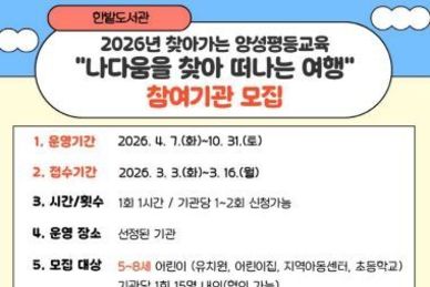 (내포투데이) 당진시는 송악도서관에서 세대 맞춤형 글쓰기 프로그램의 일환으로 만 45세 이상을 대상으로 한 ‘어른이 쓰는 어른동화(2026년 5060 신중년 인문학 교실)’를 운영한다고 4일 밝혔다. 이번 과정은 오는 7일 오전 10시 30분 사전 특강을 시작으로, 3월 21일 오전 10시부터 총 15회에 걸쳐 격주로 진행한다. 특히 당진 출신 소설가 이경희의 지도로 15명 내외의 참여자를 선발해 운영할 예정이며, 참가자들은 자신의 삶과 경험을 바탕으로 동화를 창작하게 된다. 완성된 작품은 한 권의 도서로 제작할 계획이다. 사전 특강은 누구나 참여할 수 있으며, 이경희 작가가 직접 들려주는 어른을 위한 동화 '칠성제화점' 이야기를 만나볼 수 있다. 시립도서관 관계자는 “신중년 세대를 위한 맞춤형 프로그램을 통해 시민의 삶의 질을 높이고, 배움과 소통이 이어지는 도서관 문화를 만들어 가겠다”고 말했다.