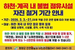 (내포투데이) 청양군이 하천의 공공 기능을 정상화하고 여름철 집중호우에 따른 재해를 사전에 방지하기 위해 3월부터 오는 9월까지 ‘하천 불법 점유 행위 일제 정비’를 추진한다고 밝혔다. 이번 정비는 정부의 하천 불법 행위 집중 관리 방침에 발맞춰 실시되며, 하천구역 및 하천 인접 국·공유지 내 무단 설치된 평상, 데크, 그늘막 등 야영 시설물은 물론 불법 경작과 수목 식재 등 하천 흐름을 방해하는 모든 무단 점유 행위를 대상으로 한다. 특히 군은 집중호우 시 통수 단면(물이 흐르는 통로의 면적)을 축소시켜 범람 피해를 유발할 우려가 있는 지장물을 중점 정비 대상으로 삼아 안전성을 확보할 계획이다. 군은 우선 3월 한 달간을 ‘홍보 및 집중 조사 기간’으로 정했다. 관내 지방하천과 소하천, 주요 계곡 일대에 대한 전수조사를 실시해 무단 점용 현황을 면밀히 파악하는 한편, 사전 안내를 통해 위반 행위자의 자발적인 철거와 원상복구를 유도할 방침이다. 실태조사 결과를 바탕으로 4월부터는 본격적인 행정처분에 돌입한다. 정당한 허가 없이 하천을 점용하거나 국·공유지를 무단 사용한 경우