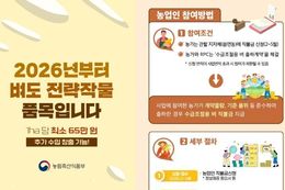 (내포투데이) 공주시는 식량 자급률 향상과 쌀 수급 안정을 위해 2026년 전략작물직불제 사업 신청을 5월 29일까지 받는다고 밝혔다. 전략작물직불금은 논에 벼 대신 수입 의존도가 높은 전략작물을 재배하는 농업인에게 지급하는 직불금이다. 사업 신청 기간은 재배 작목에 따라 다르다. 동계작물은 2월 23일부터 4월 3일까지, 하계작물은 2월 23일부터 5월 29일까지 신청할 수 있다. 신청을 희망하는 농업인은 농지 소재지 읍면동 행정복지센터에 등록 신청서와 관련 서류를 제출하면 된다. 작목별 헥타르(ha)당 지원 단가는 동계작물의 경우 식량작물·조사료 50만 원, 밀 100만 원, 하계작물의 경우 옥수수·깨 150만 원, 두류·가루쌀 200만 원, 조사료 550만 원이다. 동계작물과 하계작물을 이모작으로 재배할 경우 1헥타르당 100만 원을 추가로 지급한다. 특히 올해부터 하계작물 지원 품목에 수급조절용 벼, 알팔파, 수수, 율무가 추가됐다. 또한 옥수수·깨(하계)의 직불금 단가는 헥타르당 100만 원에서 150만 원으로, 조사료(하계)는 500만 원에서 550만
