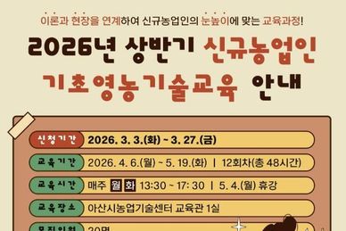 (내포투데이) 아산시는 신규농업인의 안정적인 농업·농촌 정착을 지원하기 위해 ‘2026년 상반기 신규농업인 기초영농기술교육’ 교육생을 오는 3월 27일까지 아산시농업기술센터 홈페이지를 통해 온라인으로 모집한다. 이번 교육은 농업을 처음 시작하거나 귀농을 준비하는 신규농업인 20명을 대상으로, 영농 기초역량 형성과 안정적인 영농 진입을 지원하기 위해 단계별 교육과정으로 운영된다. 교육은 2026년 4월 6일부터 5월 19일까지 매주 월·화요일 총 12회, 48시간 과정으로 아산시농업기술센터 교육관과 농업 현장에서 진행된다. 교육 과정은 △아산시 농업환경 이해 △작물생리 및 토양관리 △귀농생활 적응 △농지 및 인허가 관련 법령 △농업경영 및 세무관리 △스마트농업 기초 △병해충 관리 등 신규농업인이 영농 초기 단계에서 반드시 알아야 할 내용을 중심으로 구성됐다. 특히 이번 교육은 이론교육과 현장견학을 병행해 교육생들이 실제 농업 현장을 이해하고 영농 실행력을 높일 수 있도록 운영할 계획이다. 또한 스마트팜 시설과 귀농 우수사례 농가 등을 직접 방문하는 현장 교육을 통해 농업 현장의 실질적인 정보를 제공할