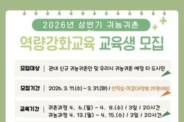 (내포투데이) 공주시는 2026년 상반기 귀농·귀촌인 역량 강화 교육에 참여할 교육생 50명을 오는 11일부터 모집한다고 밝혔다. 교육 대상은 공주시로 새로 귀농하거나 귀촌한 시민과 귀농을 준비하는 도시민 등 귀농·귀촌에 관심 있는 사람이다. 모집 인원은 귀촌 과정 25명, 귀농 과정 25명으로 각각 선착순 모집한다. 교육은 4월 6일부터 4월 15일까지의 기간 중 진행되며, 귀촌 과정 3일, 귀농 과정 3일 등 총 6일 일정으로 운영된다. 귀촌 과정은 ▲귀농·귀촌 준비와 점검 사항 ▲지역 정착을 위한 노력 ▲농촌 생활 법률 ▲귀촌 시골 창업 사례 ▲귀촌 현장 체험 등으로 구성된다. 귀농 과정은 ▲작물 선택 기준과 농업 창업 준비 ▲지능형 농업 환경 관리 이해 ▲농기계 임대사업소 견학 ▲지역 선도 농가 견학 등으로 진행된다. 김희영 농업기술센터 소장은 “이번 교육이 귀농·귀촌을 희망하는 분들에게 실질적인 도움이 되기를 바란다”며 “농업기술센터에서는 다양한 교육을 연중 운영하고 있으니 많은 관심과 참여를 바란다”고 말했다. 한편, 시는 역량 강화 교육 외에도 현장 실습 교육,