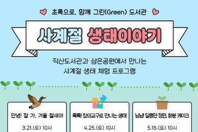 (내포투데이) 천안시 직산도서관은 생애주기별 맞춤 생태 체험 프로그램 ‘사계절 생태이야기’를 운영한다고 6일 밝혔다. 사계절 생태이야기는 올해 직산도서관의 특화주제 사업인 ‘초록을 여는, 함께 GREEN 도서관’의 첫 번째 프로그램으로, 천안시지속가능발전협의회와 협력해 상·하반기로 나눠 운영한다. 상반기에는 오는 21일 ‘안녕! 잘 가, 겨울 철새야’를 시작으로 △4월, ‘톡톡! 창의교구로 만나는 생태’ △5월, ‘냠냠! 달콤한 정원, 화분 케이크’ △6월, ‘꼭꼭 숨어라! 개구리 숨바꼭질’이 진행한다. 하반기에는 △9월, ‘안녕~ 곤충과 일촌 맺기’ △10, ‘알록달록! 단풍 패션쇼’ △11월, ‘짹짹! 새들의 열매 밥상’ △12월, ‘반가워! 다시 만난 겨울 철새야’를 운영한다. 자세한 사항은 천안시도서관 누리집에서 확인할 수 있다. 직산도서관 관계자는 “이번 프로그램을 통해 자연과 호흡하며 환경의 소중함을 배우는 시간이 되길 바란다”고 말했다.