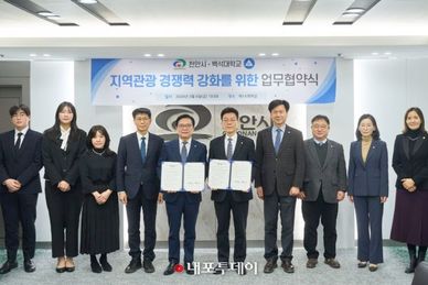 (내포투데이) 천안시가 백석대학교와 손을 잡고 지역관광 경쟁력 강화와 전문 인재 양성을 위한 체계적인 협력 체계 구축에 나선다. 천안시는 6일 시청 제1소회의실에서 김석필 천안시장 권한대행 부시장과 송기신 백석대학교 총장 등 양 기관 관계자 9명이 참석한 가운데 ‘지역관광 경쟁력 강화를 위한 업무협약’을 체결했다고 밝혔다. 이번 협약은 지역 축제와 관광 행사에 필요한 젊고 참신한 인적 자원을 확보하고, 대학의 전문 교육 과정을 현장에 접목해 관광 산업의 활력을 높이기 위해 추진됐다. 협약에 따라 양 기관은 △지역 축제 및 관광 행사 운영 시 학생 참여 활동 지원 △관광·축제 관련 교육과정 연계 프로그램 운영 △참여 활동 운영 관리 및 성과 공유 등에 대해 상호 협력하기로 했다. 특히 양 기관은 협약 이후 첫 사업으로 오는 4월 10일부터 11일까지 진행되는 천안시 야간 관광 프로그램 ‘별빛 한바퀴’ 행사에 관광학부 학생들을 투입해 실무 협력을 시작할 예정이다. 백석대학교는 18개 학부 65개 학과를 운영 중인 지역의 주요 교육기관으로, 특히 관광경영·호텔경영 등 관광학부의 전문 역량이