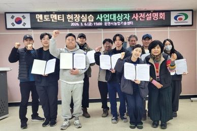 (내포투데이) 천안시농업기술센터는 6일 신규농업인을 위한 ‘멘토-멘티 현장실습 사업설명회’를 개최했다. 센터는 신규 농업인을 대상으로 선도농가의 재배기술과 경영 노하우를 체계적으로 습득할 수 있도록 현장실습을 지원하고 있다. 이날 설명회에는 신규농업인·스마트팜 선도농가 현장실습 연수생과 선도농가 농업인 등 총 12명이 참석해 멘토-멘티 간 연수 약정을 체결했다. 시는 신규농업인들의 안정적인 농촌 정착을 위해 단계별 점검과 상담을 통한 내실있는 현장실습 교육을 운영해 나갈 계획이다. 김양섭 천안시농업기술센터 소장은 “현장실습 교육은 신규농업인의 안정적인 정착을 돕는 핵심 사업”이라며 “선도농가와 함께 책임 있는 교육 운영을 통해 자립형 농업인으로 성장할 수 있도록 적극 지원할 것”이라고 말했다.