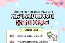 (내포투데이) 충남 계룡시가 오는 10일부터 12일까지 엄사면 향한리·도곡리 일원에서 열리는 ‘제4회 향적산 봄나들이’ 행사를 기념해 고향사랑기부제 봄맞이 이벤트를 4월 7일부터 4월 24일까지 진행한다. 이번 이벤트는 고향사랑기부제에 대한 기부 참여 분위기를 확산하기 위해 마련됐으며, 별도의 응모 절차 없이 이벤트 기간 내 계룡시에 10만 원 이상 기부하면 자동으로 응모된다. 총 100명을 추첨하여 네이버페이 1만 원 쿠폰이 제공되며, 당첨자에게 오는 5월 초 개별 문자가 발송될 예정이다. 시 관계자는 “이번 이벤트를 통해 고향사랑기부제에 시민들의 많은 관심으로 기부에 참여하여 혜택도 받아가시길 바란다”며 “모금된 기부금은 주민복리 증진 등 다양한 사업으로 소중히 활용할 계획”이라고 말했다. 한편, 고향사랑기부제는 개인이 본인의 주소지를 제외한 전국의 지자체에 연간 2,000만 원까지 기부할 수 있는 제도로, 올해부터 10만 원 초과 20만 원 이하 기부금에 대해서 세액 공제율이 16.5%에서 44%로 상향돼 기부자에 대한 혜택이 강화됐다. 기부는 전국 농협 창구뿐만 아니라 ‘고향사