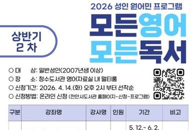 (내포투데이) 천안시 청수도서관은 내달부터 원어민 영어 독서프로그램 ‘모든 영어 모든 독서’ 수강생을 모집한다고 9일 밝혔다. 이번 프로그램은 원어민 강사와 함께 책을 읽고 소통하며 자연스럽게 영어를 배울 수 있도록 마련됐으며, 초급반과 중급반으로 나눠 운영된다. 초급 과정은 ‘영어 동화 첫걸음’과 ‘그림책으로 떠나는 세계 여행’, 중급 과정은 ‘영시로 읽는 영웅의 꿈’이 운영돼 깊이 있는 독서 경험을 제공할 예정이다. 프로그램 참여 신청은 오는 14일 오후 2시부터 가능하며, 자세한 내용은 천안시 도서관 누리집에서 확인할 수 있다. 이재순 청수도서관장은 “원어민 강사와 함께하는 독서 프로그램을 통해 시민들이 영어에 대한 자신감을 얻고, 도서관에서 유익한 자기계발의 시간을 갖길 바란다”고 말했다.