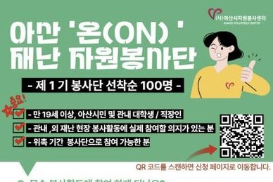 (내포투데이) 아산시는 5월 31일까지 ‘제1기 아산 온(ON) 재난봉사단’에 참여할 자원봉사자 100명을 모집한다고 밝혔다. ‘아산 온(ON) 재난봉사단’은 기존 단체 중심의 재난 대응 자원봉사 지원체계를 보완하기 위해 구성되는 개인 자원봉사 인력풀로, 평상시에는 연 1~2회의 역량 강화 교육 및 훈련에 참여하고, 재난 발생 시에는 관내·외 현장에서 피해 복구 활동에 참여하게 된다. 신청 대상은 △만19세 이상(2007년 이전 출생자) 아산시민 및 관내 대학생·직장인 △관내·외 재난 현장 봉사활동에 참여가 가능한 자 △위촉 기간 봉사단 활동에 참여 가능한 자 등이다. 참여자에게는 △봉사단 위촉장 수여 △활동인증서 발급 △우수봉사자 표창 및 교육 기회 제공 △선진지 견학 및 자원봉사 인정보상 혜택 우선 제공 △재난 현장 복구 활동 시 실비(교통비·식비) 등을 지원할 계획이다. 모집은 선착순으로 진행되며, 신청 관련 자세한 사항은 (사)아산시자원봉사센터 홈페이지 공지사항을 통해 확인 가능하고, 신청서를 작성해 센터에 제출하면 된다.