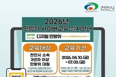 (내포투데이) 천안시가 지역 안보와 시민 안전을 책임지는 민방위 대원 4만 8,000여 명을 대상으로 ‘2026년 상반기 민방위 교육’을 실시한다고 10일 밝혔다. 이번 교육은 대원들의 편성 연차에 따라 집합교육과 사이버 교육으로 나누어 맞춤형으로 진행된다. 교육 대상별 이수 시간은 편성 1~2년차 대원의 경우 집합교육 4시간이며, 3년차 이상은 온라인을 통한 사이버 교육으로 대체된다. 사이버 교육 시간은 3~4년차 2시간, 5년차 이상은 1시간이다. 교육 내용은 민방위 제도의 이해를 포함해 응급처치, 화생방 대응, 재난 시 행동요령 등 실전 대응 능력 배양에 초점을 맞췄다. 1~2년차 대원을 위한 집합교육은 동남구 천안박물관과 서북구 천안축구센터에서 진행된다. 상반기(6월) 30회, 하반기(9·11·12월) 18회 등 총 48회에 걸쳐 운영되며, 세부 일정과 장소는 국민재난안전포털 또는 안전디딤돌 앱에서 확인할 수 있다. 사이버 교육은 오는 10일부터 7월 3일까지 운영된다. 시 누리집 또는 포털사이트에서‘디지털민방위교육 을 검색해 접속한 뒤, 교육 영상을