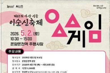 (내포투데이) 아산시와 (재)아산문화재단은 '제65회 아산 성웅 이순신축제' 기간 중 5월 2일 운영되는 참여형 프로그램 ‘ㅇㅅㅅ게임’의 사전 참가자를 4월 7일부터 오는 4월 20일까지 모집한다고 밝혔다. ‘ㅇㅅㅅ게임’은 충무공 이순신 장군의 탄신일인 4월 28일의 의미를 반영해 기획된 프로그램으로, ‘이순신’과 ‘아산시’의 초성인 ‘ㅇㅅㅅ’을 공통적으로 활용한 명칭이다. 오징어게임을 모티브로 다양한 게임을 수행하는 방식으로 진행되며, 전국에서 총 428명의 참가자를 모집한다. 이번 프로그램은 1부와 2부로 나누어 운영된다. 1부는 오전 10시 30분부터 12시 30분까지, 2부는 오후 1시부터 3시까지 진행되며, 각 부별로 214명이 참여한다. 참가자는 각 게임에 참여해 단계적으로 미션을 수행하며, 현장 상황에 따라 운영 방식이 조정될 수 있다. 각 부별 우승자에게는 갤럭시 Z 플립7, 2등에게는 갤럭시 워치8(44mm)를 제공할 예정이며, 현장 관람객을 대상으로 실시간 투표를 통해 우승자를 맞힌 경우 기프티콘(음료, 최대 100명)을 지급할 예정이다. 행사