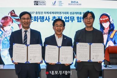 (내포투데이) 2027 충청 유니버시아드대회 조직위원회(위원장 강창희, 이하 조직위)는 10일 대전 e스포츠 경기장 ‘드림 아레나’에서 대전정보문화산업진흥원(이하 진흥원), ㈜님블뉴런과 e스포츠 연계 문화행사 추진을 위한 업무협약(MOU)을 체결했다고 밝혔다. 이번 협약은 대회의 성공 개최와 e스포츠 기반 문화행사 확산을 위해 마련됐으며, 조직위 이창섭 부위원장, 진흥원 이은학 원장, ㈜님블뉴런 김승후 대표 등 주요 관계자가 참석했다. 이번 협약을 통해 진흥원은 경기장 운영과 문화행사 공간 활용 지원을, ㈜님블뉴런은 대회와 ‘이터널 리턴 리그’ 등 자사 콘텐츠 연계를 각각 담당한다. 세 기관은 향후 e스포츠 대회를 비롯한 다양한 문화행사를 공동으로 추진하고, 운영·홍보 분야에서 협력을 강화할 예정이다. 이창섭 부위원장은 “이번 협약은 대학스포츠와 e스포츠, 문화가 융합된 새로운 형태의 국제대회 모델을 만드는 중요한 계기가 될 것”이라며 “세계 대학생들이 열광하는 차별화된 콘텐츠로 대회의 성공 개최를 이끌겠다”고 밝혔다. 이은학 원장은 “대전 e스포츠 인프라와 콘텐츠 역량을 바탕으로 대