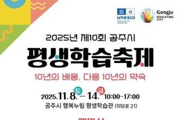 (내포투데이) 공주시는 오는 8일부터 14일까지 행복누림 일원에서 ‘10년의 배움, 다음 10년의 약속’을 주제로 제10회 공주시 평생학습축제를 개최한다. 올해 축제는 공주시가 평생학습도시로 지정된 지 10주년을 맞아 마련된 행사로, 시민이 배우고 나누는 학습공동체의 가치를 확산하고 탄소중립 실천과 지역 중심의 학습 확장을 실현하는 지속가능한 평생학습축제로 진행된다. 개회식은 11월 8일 오후 2시 행복누림 5층 대강당에서 열리며, 식전공연 ‘박동진 판소리 꿈나무’를 시작으로 평생학습 유공자 표창과 10주년 기념 퍼포먼스가 이어진다. 이후 공주시 평생학습동아리의 공연과 체험 프로그램이 진행돼 축제의 열기를 더할 예정이다. 행복누림 1층 마주침공간에서는 탄소중립 실천을 위한 친환경 체험 프로그램이 운영되며, 2층부터 5층까지는 평생학습 관련 기관과 동아리들이 운영하는 체험 및 전시 부스가 마련된다. 또한 5층 대강당에서는 다채로운 공연이 펼쳐진다. 특히 올해는 평생학습도시 지정 10주년을 기념해 각 읍면 평생학습센터가 주체가 되어 11일부터 13일까지 3일간 ‘읍면 평생학습의