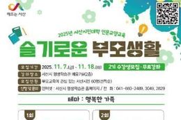 (내포투데이) 서산시는 가족의 행복을 주제로 한 부모 교육 프로그램 '슬기로운 부모생활 2기' 수강생을 11월 7일부터 11월 18일까지 모집한다고 밝혔다. 이번 강좌는 '행복한 가족'이라는 테마로 진행된다. ▲1강 '가족 愛, 행복한 가족을 위한 가족 공부' ▲2강 '화목한 가정의 공감 소통법' ▲3강 '집이 바뀌면 삶이 바뀐다 – 라이프 시프트 정리법' ▲4강 '뇌과학을 통한 행복한 자녀양육법'을 주제로 다룬다. '슬기로운 부모생활' 강좌는 11월 20일부터 12월 11일까지 매주 목요일 오후 7시에 서산시평생학습관에서 운영될 예정이다. 성기영 평생교육과장은 "삶의 중심이 되는 가족의 행복을 위해 부모의 역할을 새롭게 바라보고자 이번 프로그램을 마련했다"며 "가정 내 소통 방법부터 자녀의 성장을 돕는 실천 전략까지 다양한 주제를 통해 학부모들이 공감하고 배울 수 있는 시간이 될 것"이라고 말했다. 해당 강좌는 행복한 가정 생활에 관심 있는 서산시민 누구나 참여할 수 있다. 신청은 서산시평생학습관 홈페이지나 전화를 통해 할 수 있으며, 자세한 사항은 서산시 평생교육과로 문