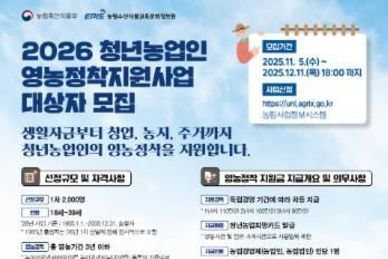 (내포투데이) 아산시는 젊고 유능한 인재의 농업 분야 진출을 지원하기 위해 ‘2026년 청년농업인 영농정착지원사업’ 신청·접수를 오는 12월 11일까지 받는다고 밝혔다. 청년농업인 영농정착지원사업은 영농 초기 소득이 불안정한 청년농업인에게 최장 3년간 월 최대 110만 원의 영농정착지원금을 지원해 안정적인 영농기반을 마련할 수 있도록 돕는 사업이다. 해당 지원금은 농가 경영비와 일반 가계자금으로 활용할 수 있다. 또한 최대 5억 원 한도 내에서 연1.5%의 저금리로 5년 거치 후 20년간 원금 균등분할 상환이 가능한 후계농 육성자금도 함께 연계 지원하며, 상·하반기에 별도의 배정평가를 실시한다. 사업 대상은 사업 시행연도 기준 18세~39세(1985.1.1.~2008.12.31. 출생자)로, 총 영농기간이 3년 이하의 농업인이다. 1985년 출생자의 경우 2026년 1차 선발에 한해 한시적으로 포함된다. 사업 신청은 농림사업정보시스템에 접속해 온라인으로 신청서 및 사업계획서 등을 제출해야 하며, 자세한 내용은 아산시청 홈페이지 또는 아산시 농업기술센터 홈페이지에서 확인할 수 있다. 김기