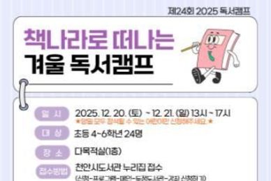 (내포투데이) 천안시 두정도서관은 내달 20~ 21일 ‘책나라로 떠나는 겨울 독서캠프’를 운영한다고 7일 밝혔다. 캠프 첫째 날에는 ‘즐겁고 신나는 레크리에이션’과 ‘숏폼보다 짜릿한 도서관 모험’ 프로그램을 통해 참가자들이 서로 소통하며 친밀감을 형성하고, 도서관 이용 방법을 배우는 시간을 갖는다. 둘째 날에는 독서캠프 활동도서 ‘숏폼지옥’의 신은영 작가를 만나 ‘디지털 단식이 필요한 이유’를 주제로 디지털 환경 속 독서의 가치에 대해 이야기를 나눌 예정이다. 독서캠프는 초등학교 4~ 6학년 24명을 대상으로 진행되며, 참가 신청은 오는 10일 오전 10시부터 천안시 도서관 누리집을 통해 선착순으로 하면 된다. 자세한 사항은 도서관 누리집을 참고하거나 두정도서관으로 문의하면 된다. 도서관 관계자는 “디지털 환경에 익숙한 어린이들이 이번 프로그램을 통해 책과 더욱 가까워지고, 도서관을 친근하게 느낄 수 있는 계기가 되길 바란다”고 말했다.