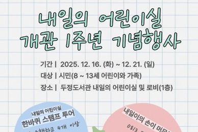 (내포투데이) 천안시 두정도서관은 오는 16~ 21일 ‘내일의 어린이실’ 개관 1주년 맞아 다채로운 기념행사를 운영한다고 15일 밝혔다. 도서관은 8~ 13세 어린이와 가족들을 대상으로 ▲내일의 어린이실 한바퀴 스탬프 투어 ▲1주년 축하 포토존 ▲내일이의 손이 머무른 책 전시 등을 선보인다. 개관일인 20일에는 어린이실에 방문하는 어린이들과 함께 축하 떡을 나누며 1주년의 의미를 함께 나눌 예정이다. 이와 함께 도서관 16주년과 크리스마스를 기념해 ‘반짝이는 리듬 케이크’ 타악기 콘서트와 특별 주문 케이크 만들기 등 다채로운 프로그램을 통해 1주년을 축하할 예정이다. 두정도서관 관계자는 “1주년 기념행사를 통해 어린이와 가족 모두가 행복한 시간을 보내기를 바란다”며 “내년에도 내일의 어린이실을 내실있게 운영할 수 있도록 노력할 것”이라고 말했다. 한편, 지난 11월까지 8만 3,000여 명의 어린이들이 내일의 어린이실을 이용했으며, 81개교 1,559명의 어린이가 회원으로 가입했다.
